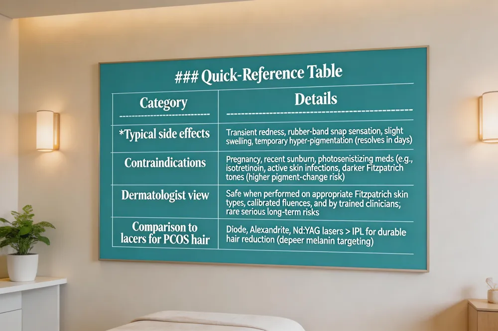 Typical side effects are mild and short‑lived: transient redness, a rubber‑band‑snap sensation, slight swelling, or temporary hyper‑pigmentation that usually resolve within a few days with proper after‑care. Contraindications include pregnancy, recent sunburn, photosensitizing medications (e.g., isotretinoin), active skin infections, and darker skin tones that increase pigment‑change risk.