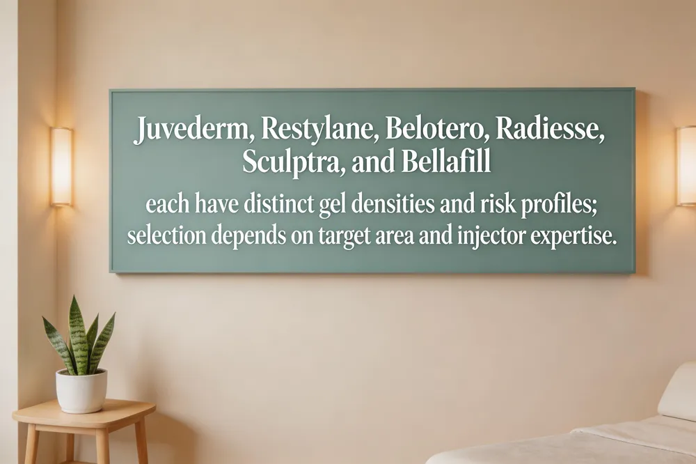 Top brands and their specialties include Juvederm and Restylane (HA fillers reversible with hyaluronidase), Belotero (soft gel for delicate lines), Radiesse (calcium‑hydroxylapatite for deeper folds and hand rejuvenation), Sculptra (poly‑L‑lactic acid collagen stimulator), and Bellafill (permanent PMMA microspheres).