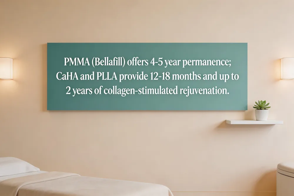 Collagen‑stimulating fillers such as calcium hydroxylapatite (CaHA) and poly‑L‑lactic acid (PLLA) offer a middle ground: CaHA delivers volume and collagen remodeling for up to 12‑18 months, while PLLA builds new collagen over several months with effects lasting up to two years.