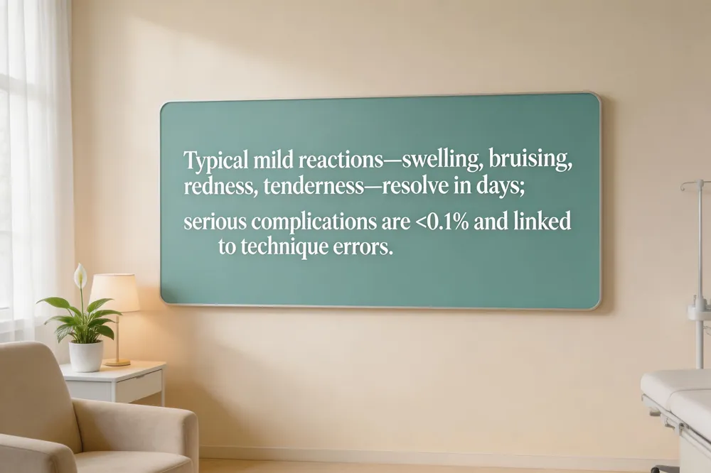 Typical mild reactions after a dermal‑filler injection include localized swelling, bruising, redness and tenderness that usually resolve within a few days. Small lumps or nodules may appear but can often be softened with massage or, rarely, a corrective injection. Before‑and‑after photos from reputable clinics vividly illustrate this healing process: the first images may show darker or swollen areas around the lips, cheeks, or nasolabial folds, which fade as the skin settles, while later photos reveal the smooth, natural‑looking results patients expect. Rare serious complications such as vascular occlusion, skin necrosis or vision loss occur in less than 0.1 % of cases according to 2022 FDA post‑market data, and are most often linked to incorrect technique or unapproved products. When performed by a board‑certified injector using FDA‑approved fillers, the risk is minimal, and any unexpected side effect should be evaluated promptly by a qualified professional.