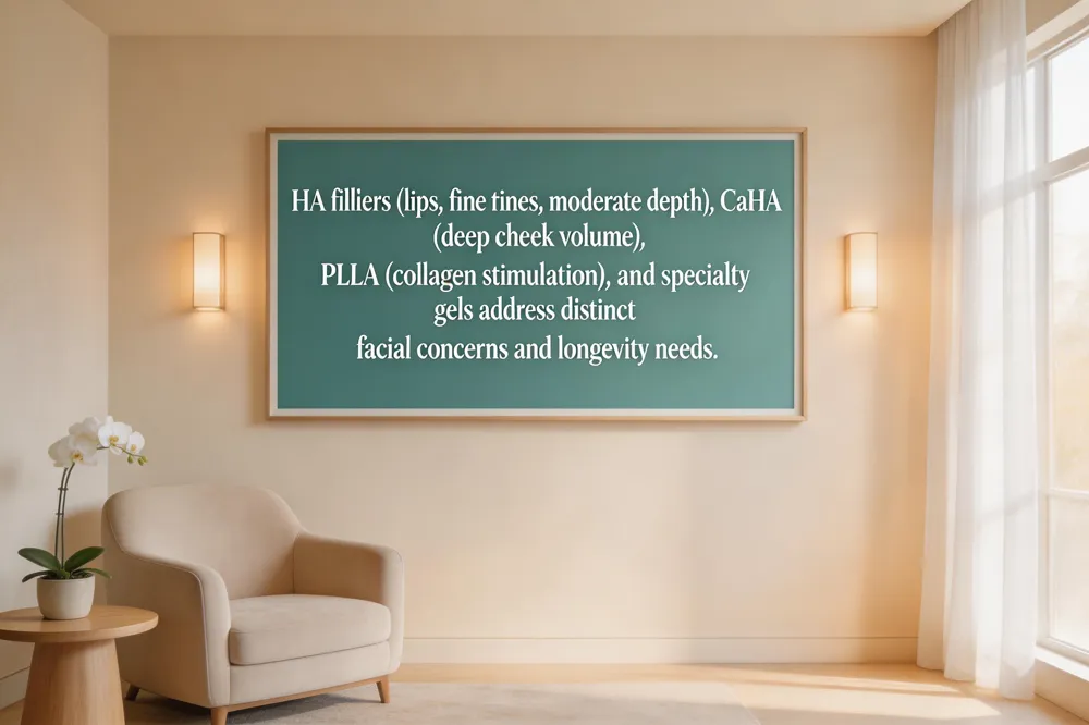 Dermal fillers fall into several FDA‑approved categories. Hyaluronic‑acid (HA) fillers—such as Juvederm Ultra, Voluma, Restylane Lyft, Belotero Balance and Teosyal RHA—are naturally occurring, reversible with hyaluronidase, and suited for lips, fine lines, and moderate to deep volume loss in cheeks and nasolabial folds. Calcium‑hydroxylapatite (CaHA) fillers like Radiesse provide a mineral‑based gel that stimulates collagen and is ideal for deeper cheek augmentation and cheek contouring, lasting about 12‑18 months. Poly‑L‑lactic‑acid (PLLA) stimulators (Sculptra) act as collagen inators, delivering gradual, long‑lasting volume (up to two years) after a series of sessions. Specialty products target specific areas: HA fillers (Volbella, Juvéderm Silk) give subtle lip enhancement; HA gels with smaller particles (Belotero Soft) treat fine perioral lines; thicker HA (Voluma) and CaHA (Radiesse) restore cheek fullness; and HA with higher elasticity (Teosyal RHA) smooth under‑eye tear troughs. Selecting the right filler depends on treatment depth, desired longevity (6 months to 2 years for HA, up to 3 years for CaHA, 2 years for PLLA), and the patient’s natural‑look preference.