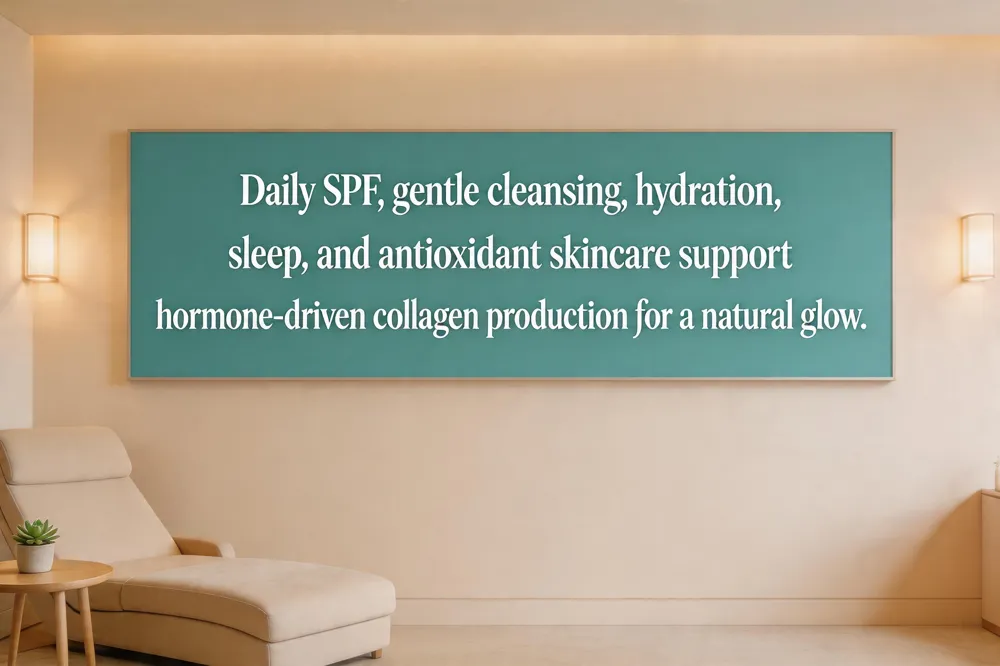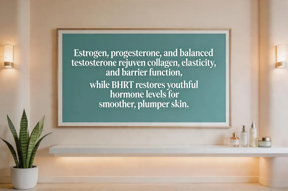 What hormones improve skin? Estrogen, progesterone and balanced testosterone are key. Estrogen stimulates collagen and hyaluronic acid; progesterone enhances barrier function; testosterone supports oil balance and fibroblast health. Together they create smoother, plumper skin.
