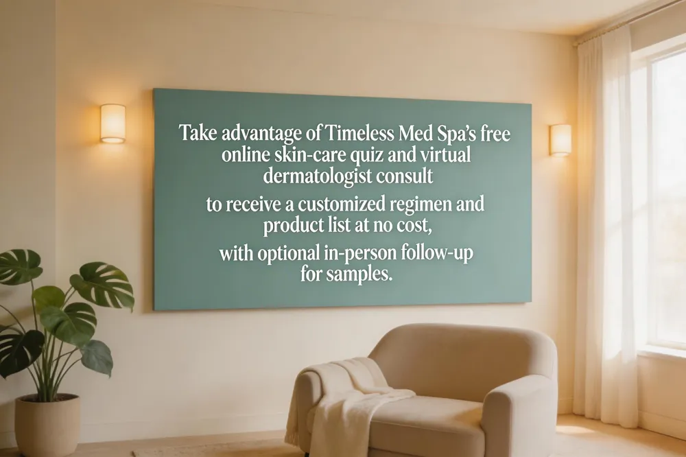 Timeless Med Spa makes starting a personalized skin‑care journey effortless. Our free online skin‑care quiz asks a few quick questions about your skin type, top concerns, lifestyle and ingredient preferences. Within minutes a board‑certified dermatologist generates a customized regimen—from a three‑product routine to a six‑step protocol—highlighting the best in‑spa treatments (microneedling, peels, LED therapy, etc.) and product recommendations that match your goals of natural enhancement and graceful aging. The quiz is completely cost‑free and requires no appointment; you can also schedule a brief in‑person consult to refine the plan and receive a complimentary sample serum or mask. For those who prefer a hands‑on approach, our personalized skincare plan is provided at no charge after a short questionnaire or quick consultation, ensuring you leave with a clear, science‑backed roadmap to healthier, more radiant skin.