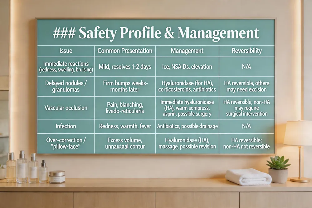 | Over‑correction / “pillow‑face” | Excess volume, unnatural contour | Hyaluronidase (HA), massage, possible revision | HA reversible; non‑HA not reversible |
