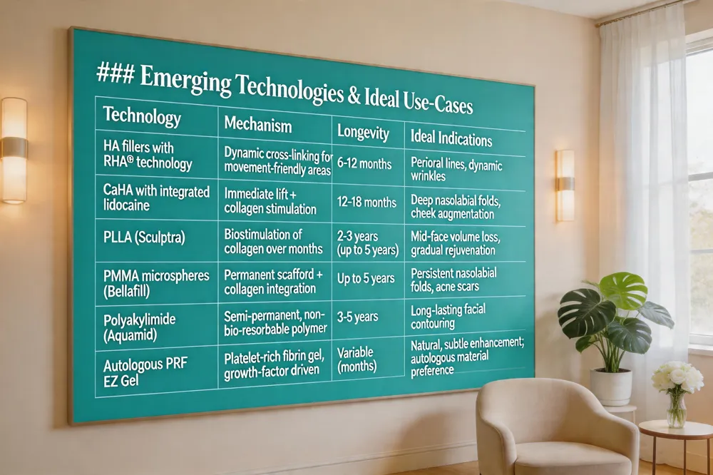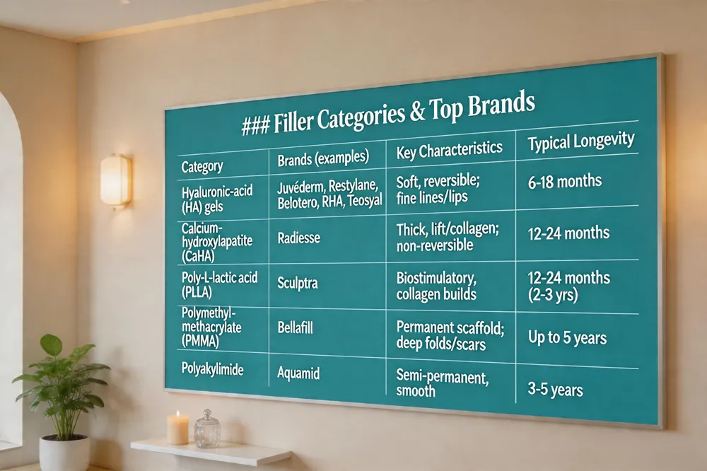 Types of filler brands – HA fillers (Restylane, Juvéderm, Belotero, RHA) are reversible and ideal for lips and superficial wrinkles; CaHA (Radiesse) provides firm lift and collagen boost; PLLA (Sculptra) builds collagen gradually for long‑lasting mid‑face volume; PMMA (Bellafill) and polyalkylimide (Aquamid) give semi‑permanent correction.