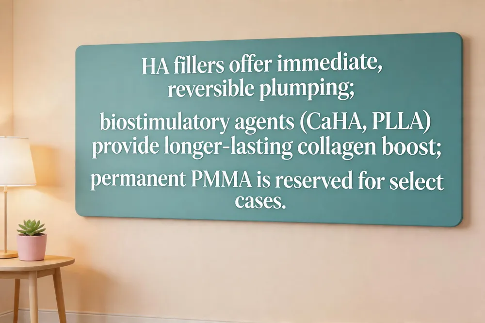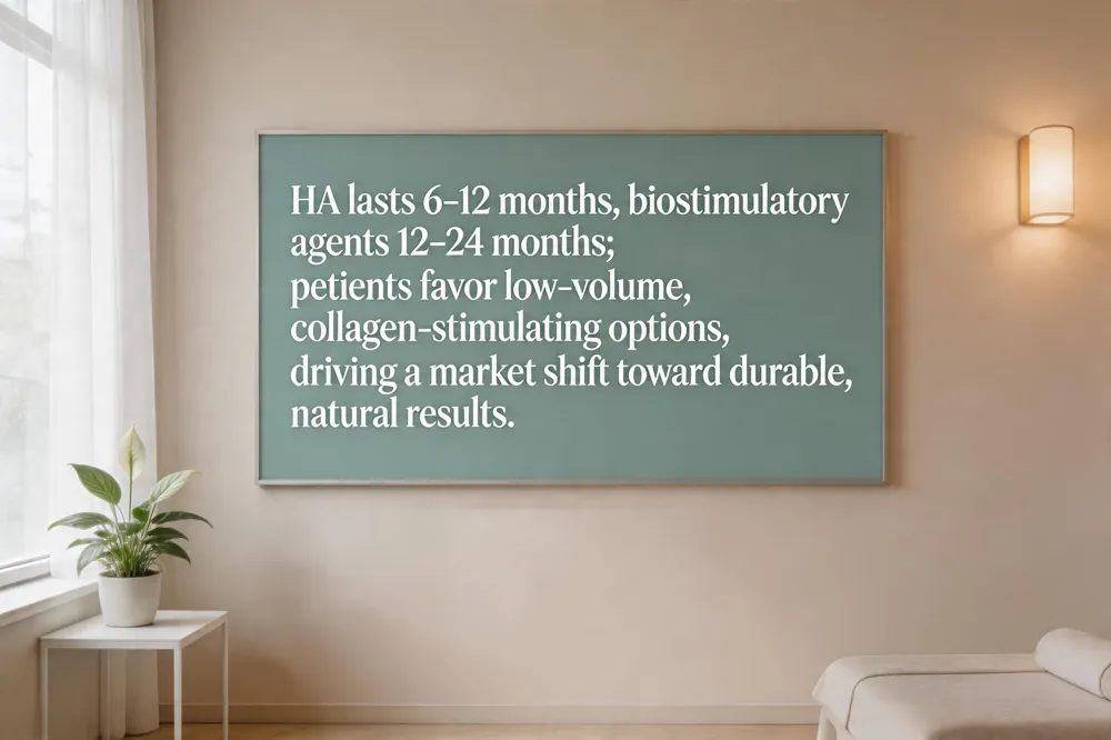 Hyaluronic‑acid (HA) fillers typically last 6–12 months, while calcium‑hydroxylapatite (CaHA) and poly‑L‑lactic acid (PLLA) can persist 12–24 months or longer because they stimulate collagen production. Clinics now recommend maintenance appointments every 6–12 months for HA and 9–18 months for biostimulatory agents to keep volume consistent without over‑filling.