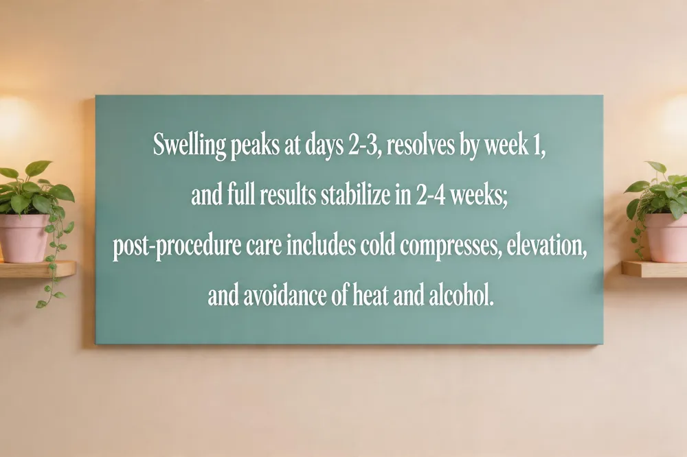 Post‑procedure, mild swelling, bruising, and tenderness are normal. Swelling usually peaks on days 2‑3, then recedes; by the end of the first week the bulk of puffiness is gone and the area looks more natural. Full, stable results settle between two to four weeks as the filler integrates and any residual edema resolves. For optimal recovery, patients should avoid heavy exercise, heat, and alcohol for 24‑48 hours, apply cold compresses, and keep the head elevated.