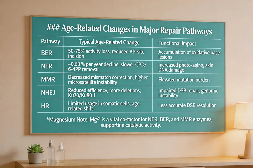 | Process | Primary Lesions | Main Repair Pathway(s) | Age‑Related Decline |