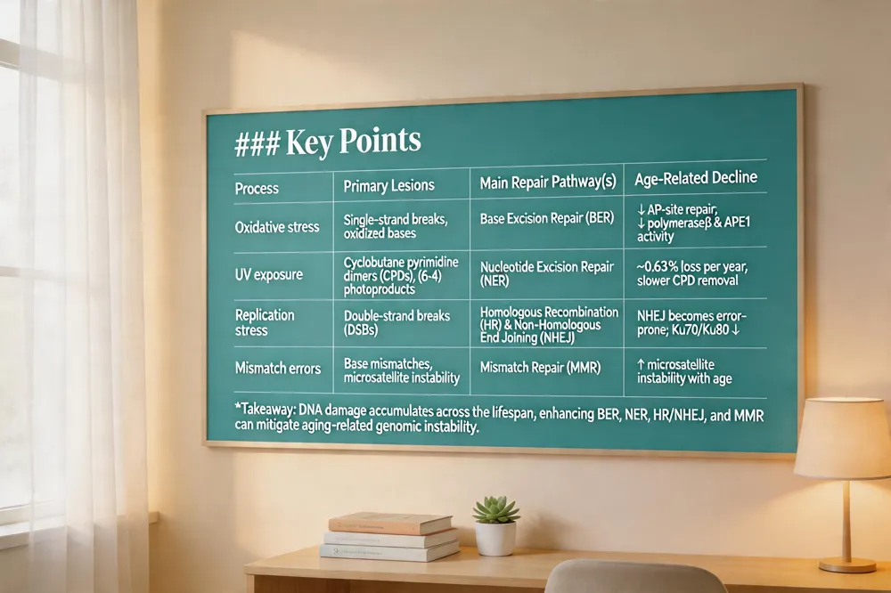 Takeaway: DNA damage accumulates across the lifespan; enhancing BER, NER, HR/NHEJ, and MMR can mitigate aging‑related genomic instability.