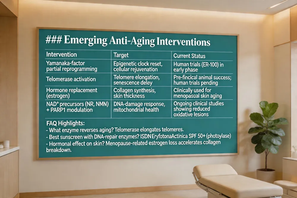 | Telomerase (experimental) | Topical gene‑therapy vectors | Telomere shortening | Extends telomere length, delays senescence (pre‑clinical) |