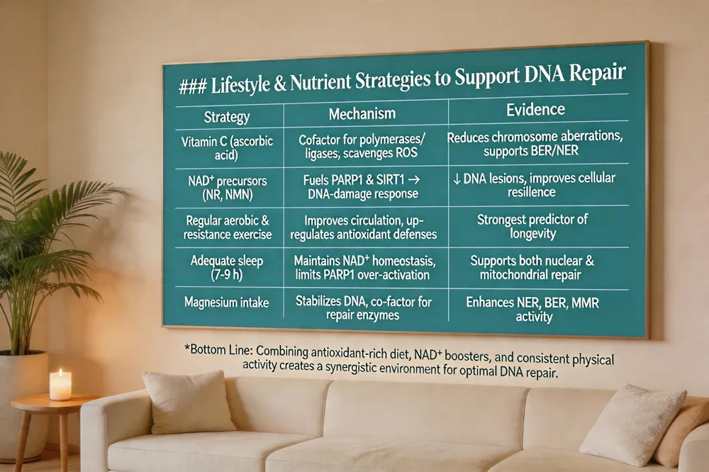 Bottom Line: Combining antioxidant‑rich diet, NAD⁺ boosters, and consistent physical activity creates a synergistic environment for optimal DNA repair.