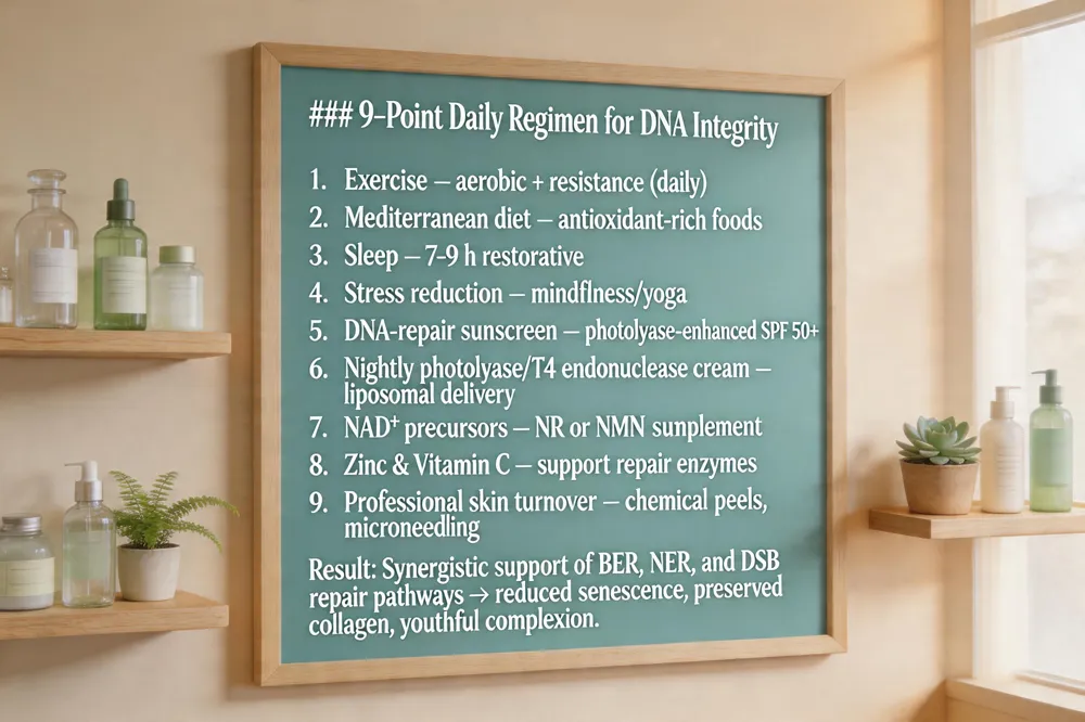 In practice, combining a nutrient‑rich diet, targeted supplements, and consistent activity complements professional skincare—such as liposome‑encapsulated photolyase creams—to sustain DNA integrity and promote a youthful complexion.
