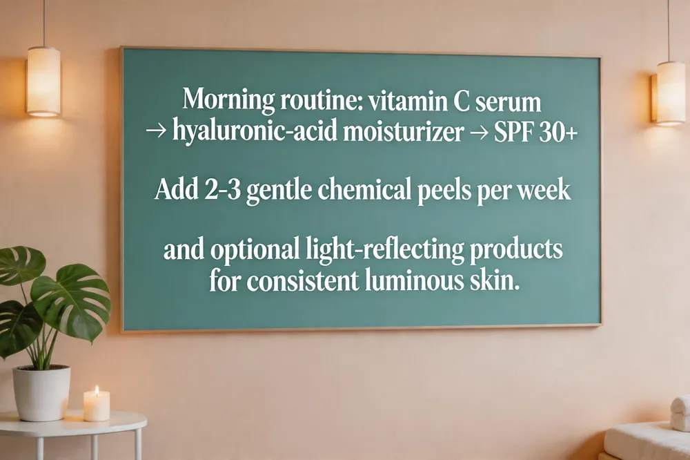 Achieving a luminous complexion each day starts with three core habits: hydration, gentle exfoliation, and antioxidant protection. Begin every morning with a vitamin C serum; its brightening power neutralizes free radicals, evens tone, and kick‑starts collagen synthesis. Follow with a lightweight hyaluronic‑acid moisturizer to lock in moisture and create a plump, light‑reflective surface. Finish with a broad‑spectrum SPF 30+ sunscreen to guard against UV‑induced dullness and pigment loss. Schedule 2‑3 gentle exfoliation sessions per week using a mild chemical peel—such as lactic acid or a PHA—to remove dead cells and reveal fresh skin underneath. For an instant glow, add a light‑reflecting or self‑tanning product that enhances radiance without additional sun exposure. Consistently combining these steps delivers a radiant, healthy complexion while supporting long‑term skin health.