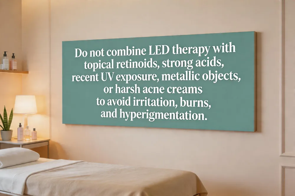 Topical retinoids and acids – Strong retinoids, glycolic or lactic acid peels, and other exfoliating agents can irritate the skin when combined with LED exposure. Avoid applying them on the day of treatment and allow the barrier to recover before resuming use.
