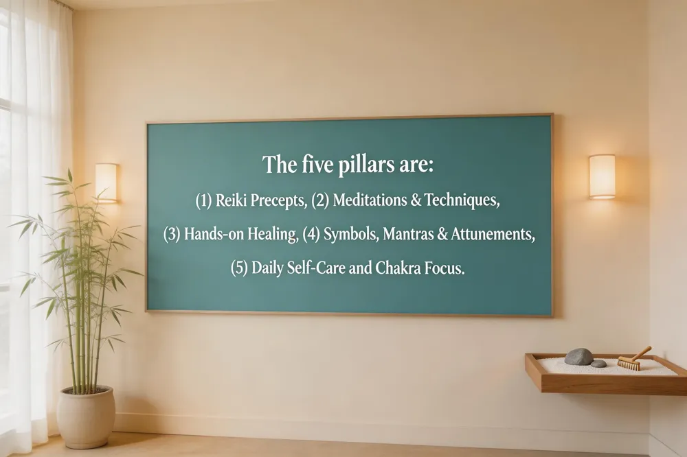 Answer: The five pillars of Reiki are: (1) Reiki Precepts (Gokai), (2) Reiki Meditations and Techniques (Kokyû Hô), (3) Hands‑on Healing (Tenohira), (4) Reiki Symbols and Mantras (Shirushi and Jumon), and (5) Reiju and Attunements.