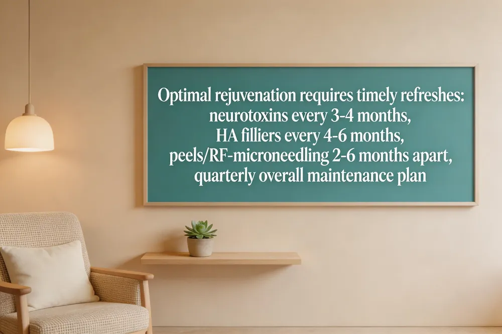 For injectable neurotoxins like Botox or Dysport, a 3‑ to 4‑month refresh is typical, because the effect wanes as muscle activity resumes. Hyaluronic‑acid fillers generally retain volume for 4‑6 months (longer for deeper, high‑density products), so a touch‑up at that point helps preserve facial contours.