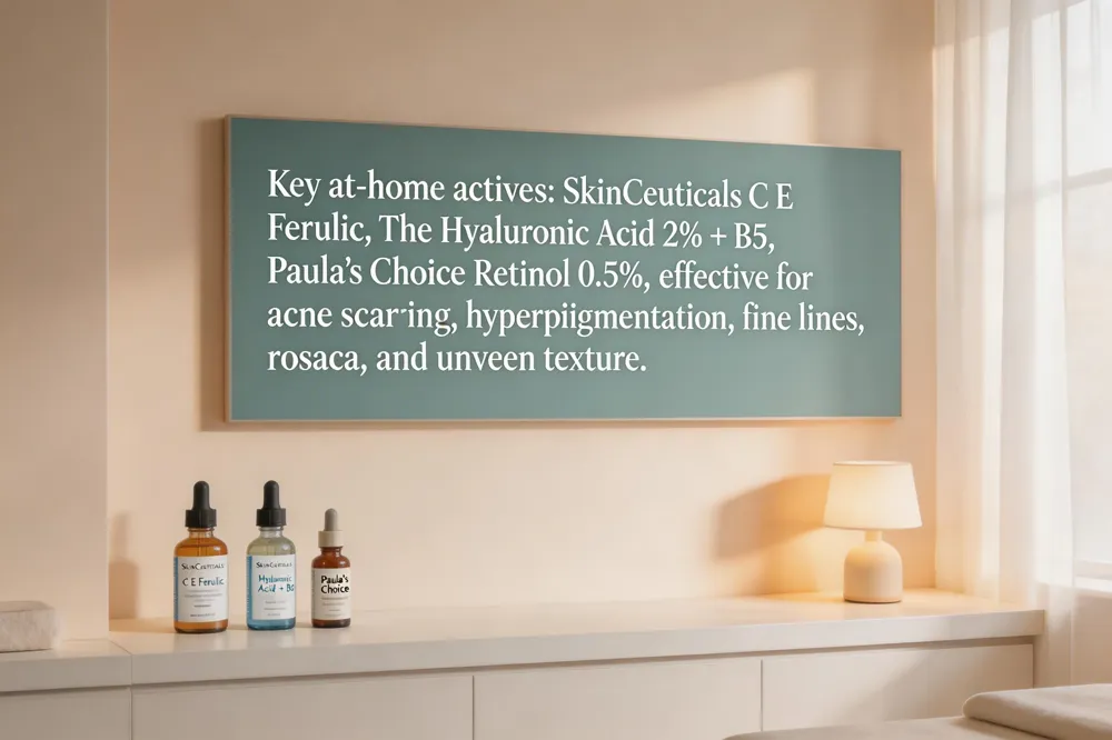 A successful at‑home routine begins with daily broad‑spectrum SPF and a vitamin C serum to protect against UV damage while boosting collagen. Follow with a hyaluronic‑acid moisturizer for deep hydration and incorporate a weekly retinol to smooth fine lines and refine texture. Gentle exfoliation 1‑3 times per week and a weekly at‑home facial—cleanse, soothing mask, light facial—promote circulation and maintain clinical results. Good hydration, antioxidant‑rich nutrition, and occasional natural oils (rosehip or argan) further support skin health.