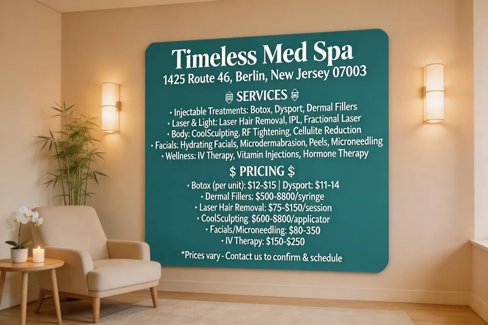 Timeless Med Spa in Berlin, New Jersey is a convenient, full‑service medical spa that specializes in non‑invasive body‑sculpting. The clinic offers a range of FDA‑cleared technologies—including TruSculpt ID, CoolSculpting, and EMSCULPT NEO—to target stubborn fat, cellulite, and loose skin on the abdomen, love handles, thighs, arms, buttocks, chin and back. Each client begins with a personalized consultation where a registered nurse evaluates goals, medical history, and lifestyle, then tailors a treatment plan that may combine TruSculpt’s monopolar radiofrequency with other modalities for optimal contouring and skin tightening. Pricing is transparent and varies by treatment area size; typical TruSculpt sessions range from $300 for a small zone to $1,800 for larger or multiple areas, with financing options such as Care Credit available. Results become visible within 5‑12 weeks, and most patients need 1‑3 brief (15‑30 minute) sessions spaced 6‑8 weeks apart for lasting fat‑cell reduction and improved skin elasticity. If you search for “Body sculpting near me,” “truSculpt near me,” or “Timeless Med Spa body contouring near me,” schedule a consultation at the Berlin location and discover a safe, effective, and personalized path to a smoother silhouette.