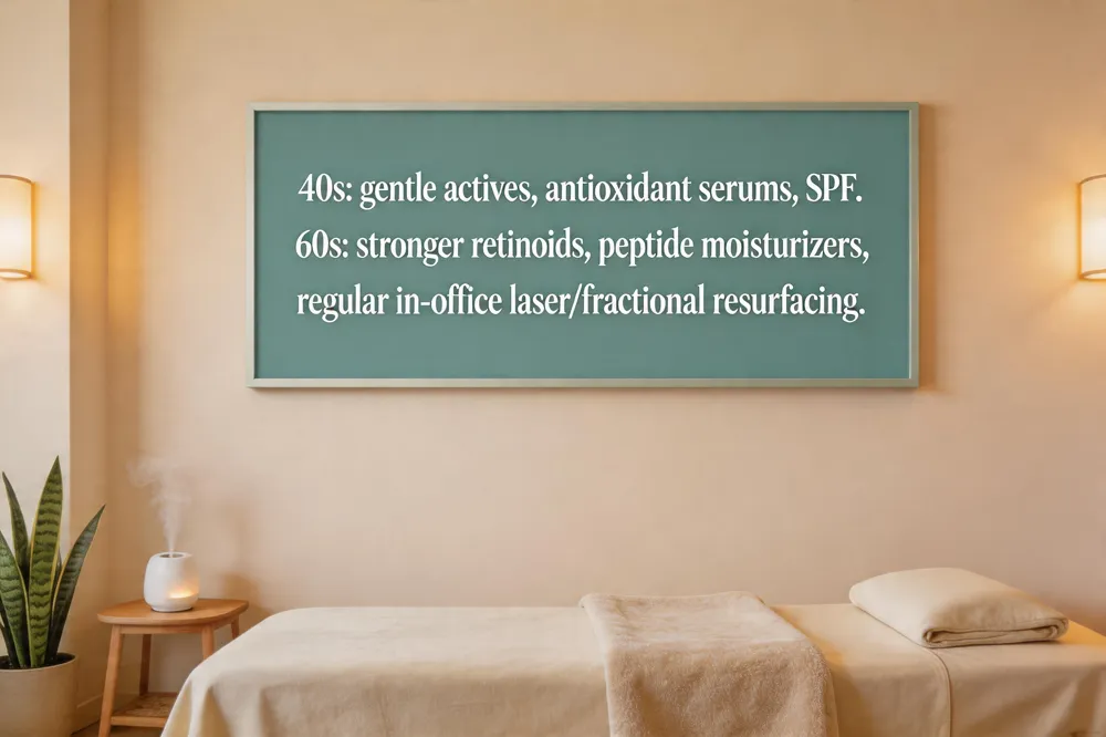 For a 60‑year‑old, the hierarchy shifts toward stronger actives: nightly retinoids (tretinoin or prescription retinol) paired with peptide serums to revive elasticity. Hydration‑dense moisturizers with ceramides and growth‑factor complexes protect the thinning barrier. In‑office treatments every 4‑6 weeks—fractional laser resurfacing, IPL, or PRP facials—address deep lines, age spots, and volume loss. Targeted injectables (Botox, hyaluronic‑acid fillers) round out the protocol. Nutritionally, emphasize omega‑3‑rich foods, abundant antioxidants, and at least 2 L water daily; regular aerobic exercise and 7‑8 hours sleep support cellular repair. Consistent sunscreen use and quarterly follow‑ups ensure lasting, natural‑looking results.