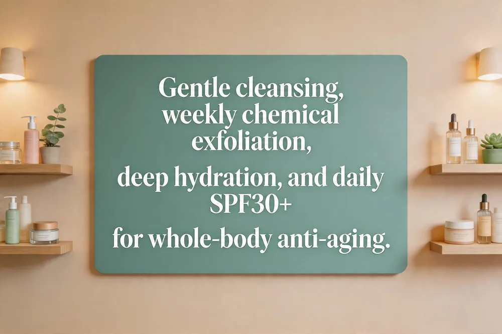 Answer to: "What anti‑aging skin‑care routine do you recommend for women in their 40s?" Morning: gentle hydrating cleanser → vitamin C antioxidant serum → broad‑spectrum SPF 30+. Evening: gentle cleanser → retinoid or peptide serum → rich night‑cream with ceramides. Incorporate a weekly HydraFacial or diamond‑glow facial at the spa for deeper renewal, and maintain weekly body exfoliation and daily sunscreen for comprehensive anti‑aging benefits.