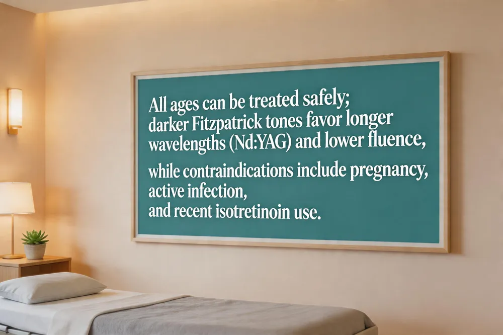 Laser resurfacing is not limited by age; patients in their 70s can safely undergo treatment when health and skin elasticity are evaluated. Modern fractional and ablative devices (e.g., CO₂, Fraxel, UltraClear) use customizable energy settings and cooling, allowing comfortable procedures and the healing even for mature skin. Fitzpatrick skin typing guides wavelength selection—longer wavelengths (Nd:YAG, 1064 nm) and lower fluence are preferred for darker tones (IV‑VI) to minimize hyperpigmentation. Contra‑indications include pregnancy, active infections, recent isotretinoin use, uncontrolled connective‑tissue disease, and certain medications; a thorough medical history is essential. Personalized planning—starting with lower‑energy test spots, spacing sessions appropriately, and prescribing strict post‑care (sun protection, hydration, gentle moisturizers)—optimizes outcomes and reduces downtime. Costs vary: non‑ablative options $600‑$900 per session, ablative CO₂ $2,500‑$5,000, with financing often available.