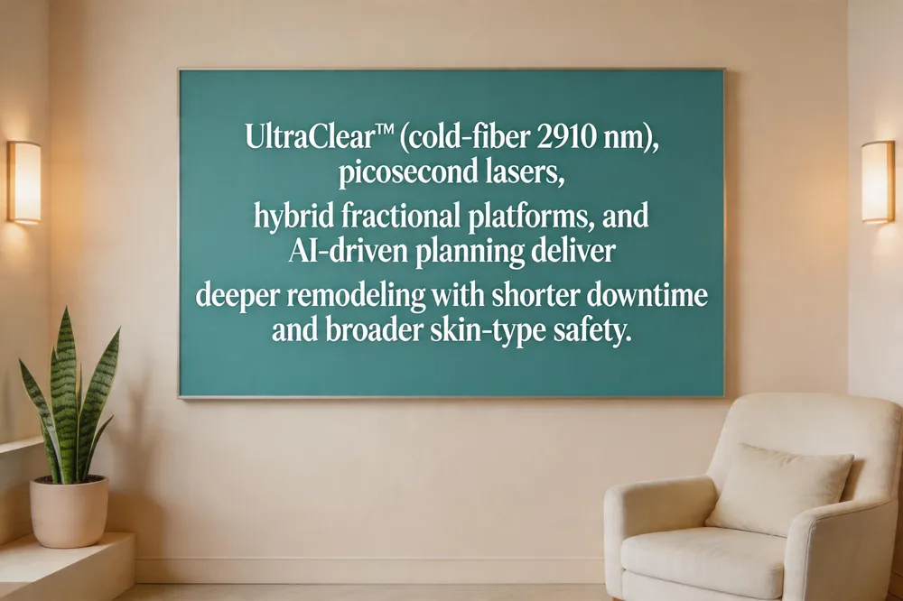 Modern resurfacing has leapt forward with ultra‑precise devices that balance dramatic results and gentle recovery. UltraClear™ with Laser‑Coring™ is the first FDA‑cleared cold‑fiber ablative system (2910 nm) that creates microscopic micro‑columns (≈360 µm) to remove aged tissue while sparking deep collagen and elastin growth. Downtime is 2‑5 days, and the 2‑910 nm wavelength is safe for all Fitzpatrick tones, delivering a mini‑facelift effect without surgery.