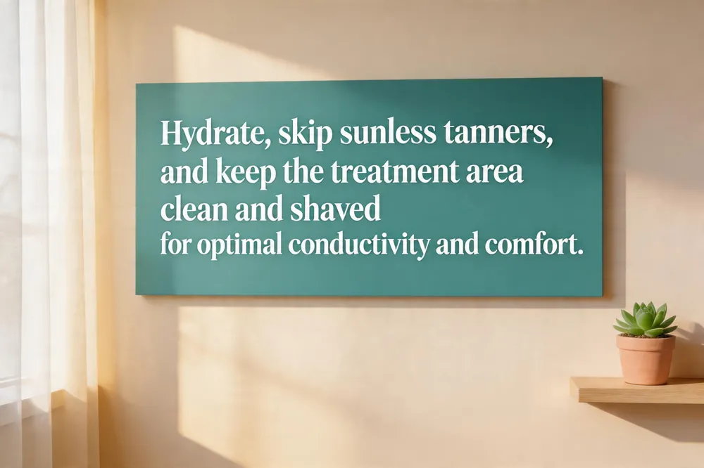 Before your initial truSculpt session, focus on hydration, nutrition, and skin preparation. Drink at least eight glasses of water daily in the days leading up to the appointment to improve radio‑frequency conductivity, and eat a light, balanced meal before the visit to prevent fatigue and cramps. Two weeks out, discontinue sunless tanners and avoid excessive sun exposure for at least one week to reduce skin irritation. On the day of treatment, the area must be clean, dry, and free of creams, lotions, powders, or numbing medications. Shave any excess hair on the treatment site and upper back so the pads adhere properly; the clinic can shave for you if needed. Wear loose, comfortable clothing and remove any jewelry or piercings near the area. Medication and lifestyle adjustments include limiting alcohol and caffeine for 24 hours, avoiding blood‑thinners (aspirin, ibuprofen) and fish oil unless your provider advises otherwise, and postponing anti‑inflammatory drugs for up to three months after treatment to maximize fat‑cell destruction.