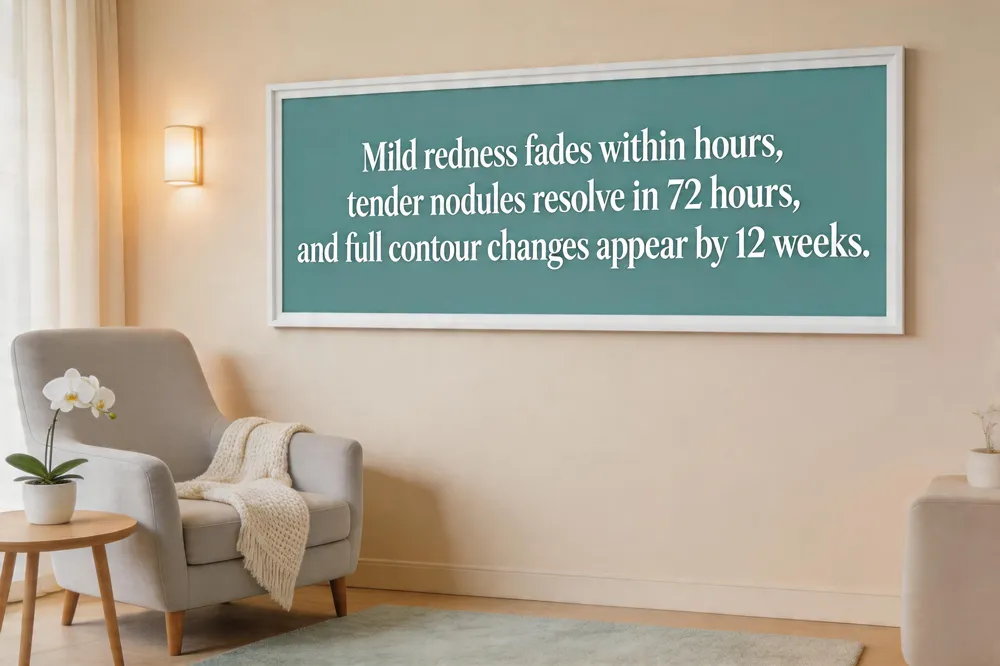 Redness, swelling, and tender nodules – Expect temporary warmth and a flushed appearance; these are normal and subside quickly. If blisters, crusting, or persistent swelling beyond a few days occur, contact your provider.