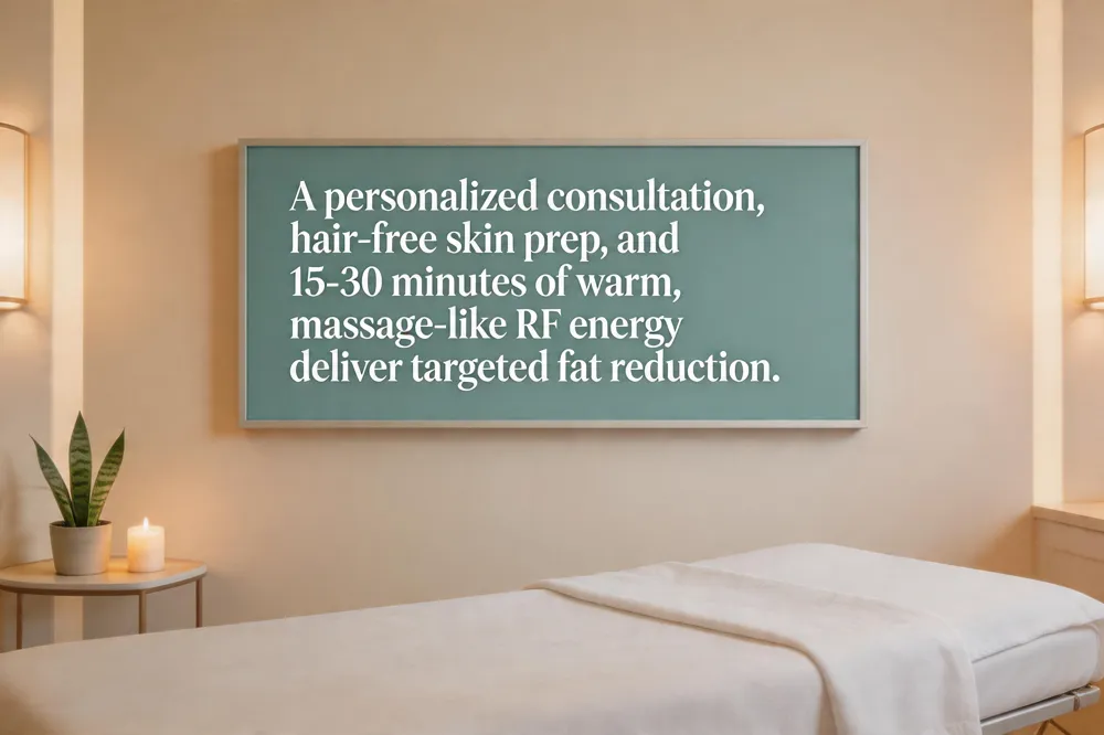 Next, the treatment area is prepped: any excess hair is shaved, jewelry removed, and the skin is cleaned and left completely dry. Radio‑frequency (RF) pads are then applied to the selected zones—whether it’s the abdomen, thighs, love handles, or another stubborn‑fat pocket. Each pad delivers controlled monopolar RF energy for about 15–30 minutes per area, heating the sub‑cutaneous fat to 42‑45 °C while sparing surrounding tissue.